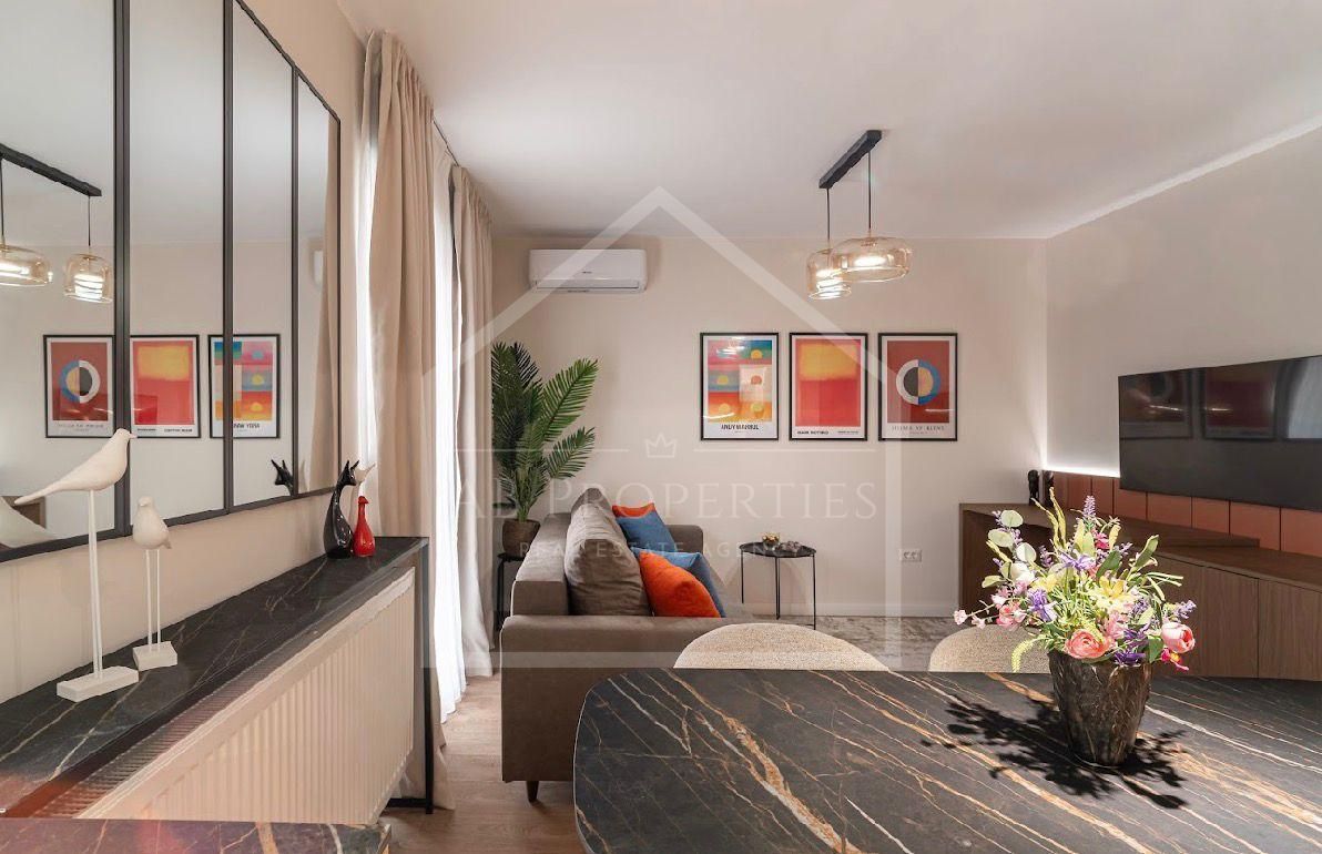 Apartament cu 2 camere, situat în zona Bucureștii Noi, disponibil la prima închiriere, într-un bloc boutique nou. Complet mobilat și utilat modern, cu finisaje de lux și mobilier nou. Dispune de living luminos, dormitor confortabil, bucătărie complet echipată și baie elegantă. Compartimentare eficientă și design modern. Dotări: – bucătărie complet utilată (cuptor, plită, hotă, frigider, cuptor cu microunde) – mașină de spălat vase – mașină de spălat rufe + uscător haine – aer condiționat – iluminat ambiental – spații de depozitare Loc de parcare subteran inclus în preț. Zonă liniștită, cu acces facil către transport și magazine. Ideal pentru o persoană sau un cuplu.