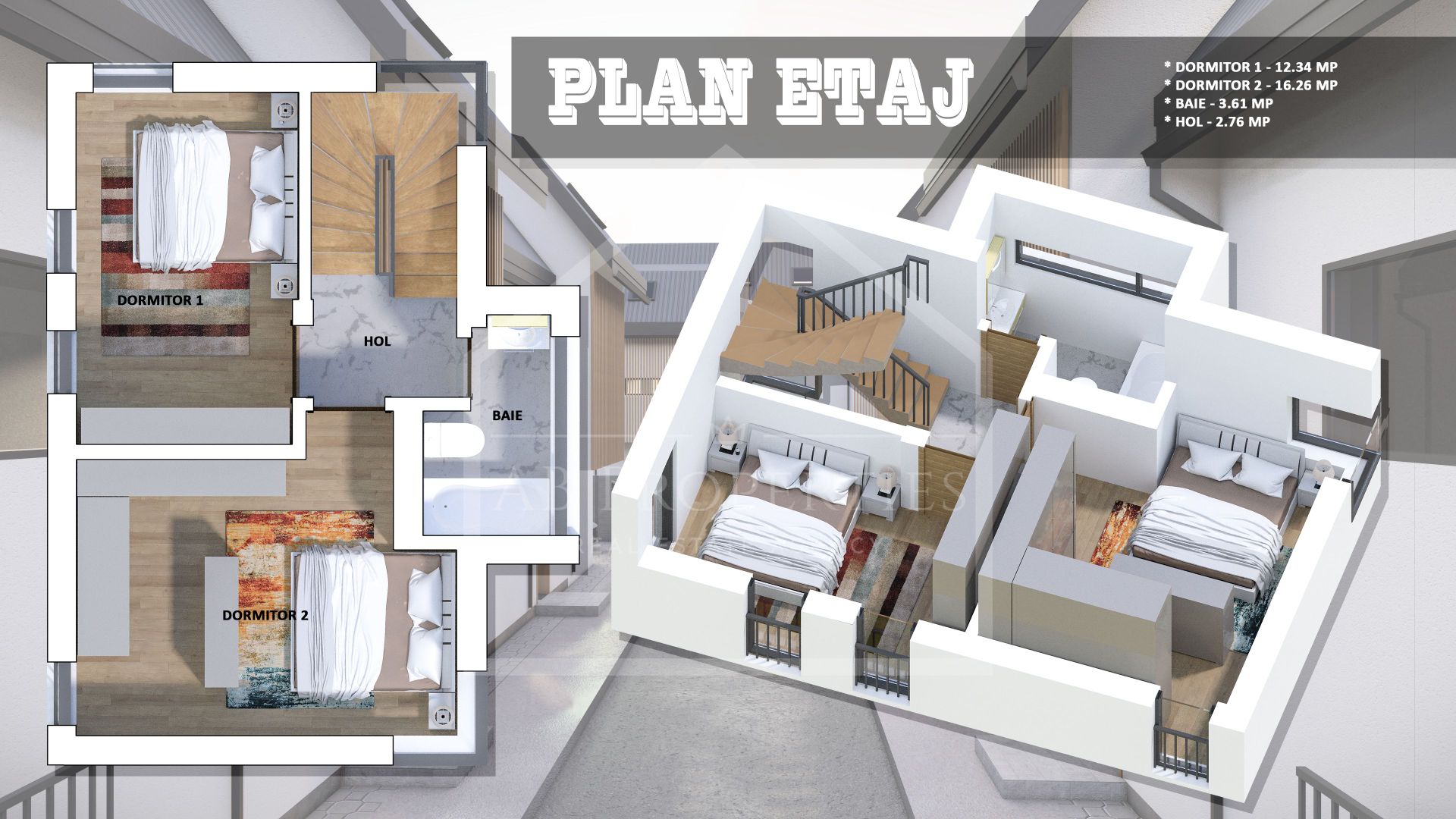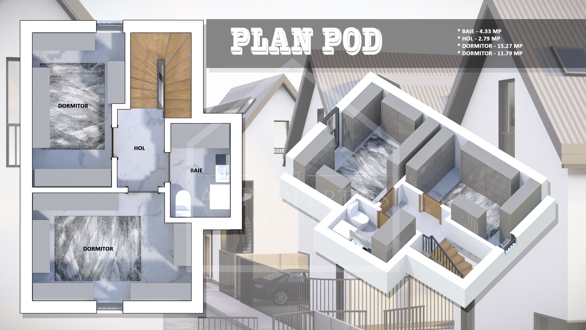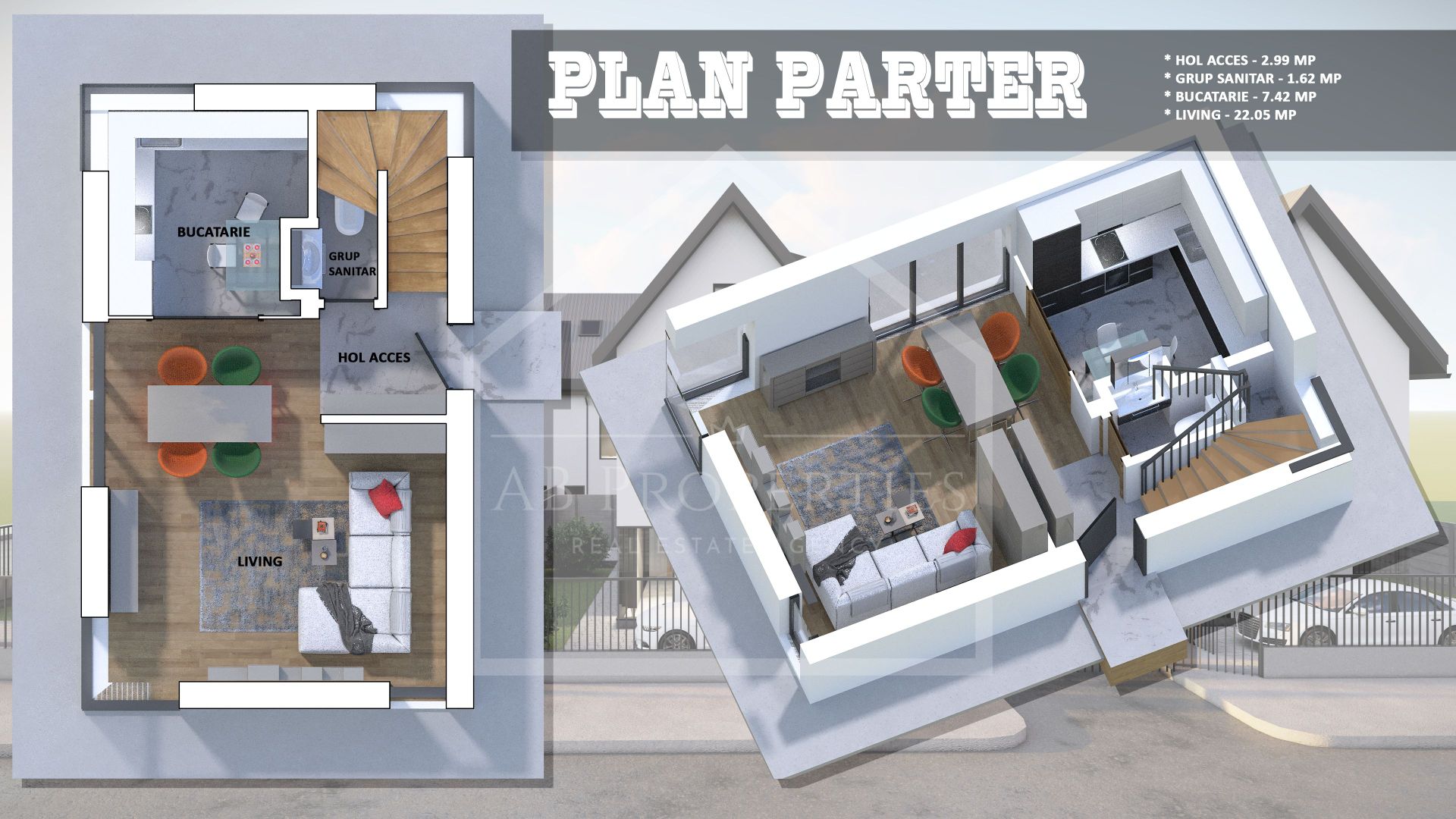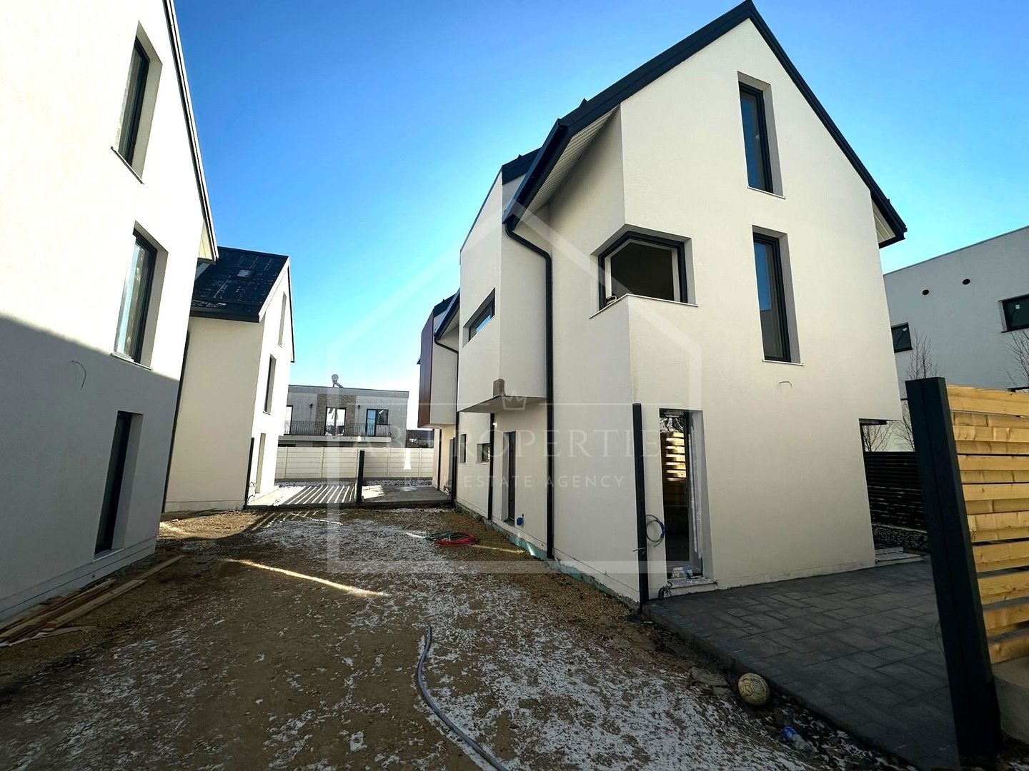 Va prezentam un nou proiect rezidential compus din 9 case individuale si cuplate. Acestea sunt compuse din living, bucatarie,4 dormitoare si 3 bai cu un regim de inaltime P+1+Pod si dispun de 2 locuri de parcare. Suprafetele loturilor de teren difera in functie de tipul de casa ales. Preturile pentru aceste proprietati incep de 235.000+TVA. Toate casele din ansamblu sunt predate complet finisate la interior si exterior, cu toate utilitatile necesare (gaze, energie electrica, apa-canal). Finisajele includ • Obiecte sanitare Romstal • lnstalatia termica pe structura PPR • Incalzire in pardoseala • Ventilator rescuprare caldura in fiiecare camera • Centrala Termica Ariston cu senzor de ambianta. • Scara interioara moderna, din lemn si balustrada aferenta. • Trasee aer conditionat montate • Tamplarie PVC Salamander Gri antractit, cu geamuri tripan Bluevolution 92 • Pod termoizolat cu celuloza Isocell, grosime 15 cm • Acoperis tip sarpanta de lemn cu invelitoare din tabla faltuita • Termoizolatie exterioara cu polistiren extrudat grafitat de 10 cm, EPS 80-100 mm • Monitorizare video exterioara 24/7 • Acces fibra optica internet-tv Digi. • Racord 380 V pentru incarcare autoturism • Optional montaj de panouri Fotovoltaice • Peretilor interior sunt acoperiti cu vopsitorii ultra-lavabile de culoare Alba • Parchet triplu stratificat de cea mai buna calitate • Fainta, Gresie antiderapanta si piatra naturala • Usile la interior sunt din lemn • Usa de acces din PVC termoizolata interior/exterior cu balamale ascunse. Pentru detalii suplimentare, va stam la dispozitie! Cu stima, AB Properties
